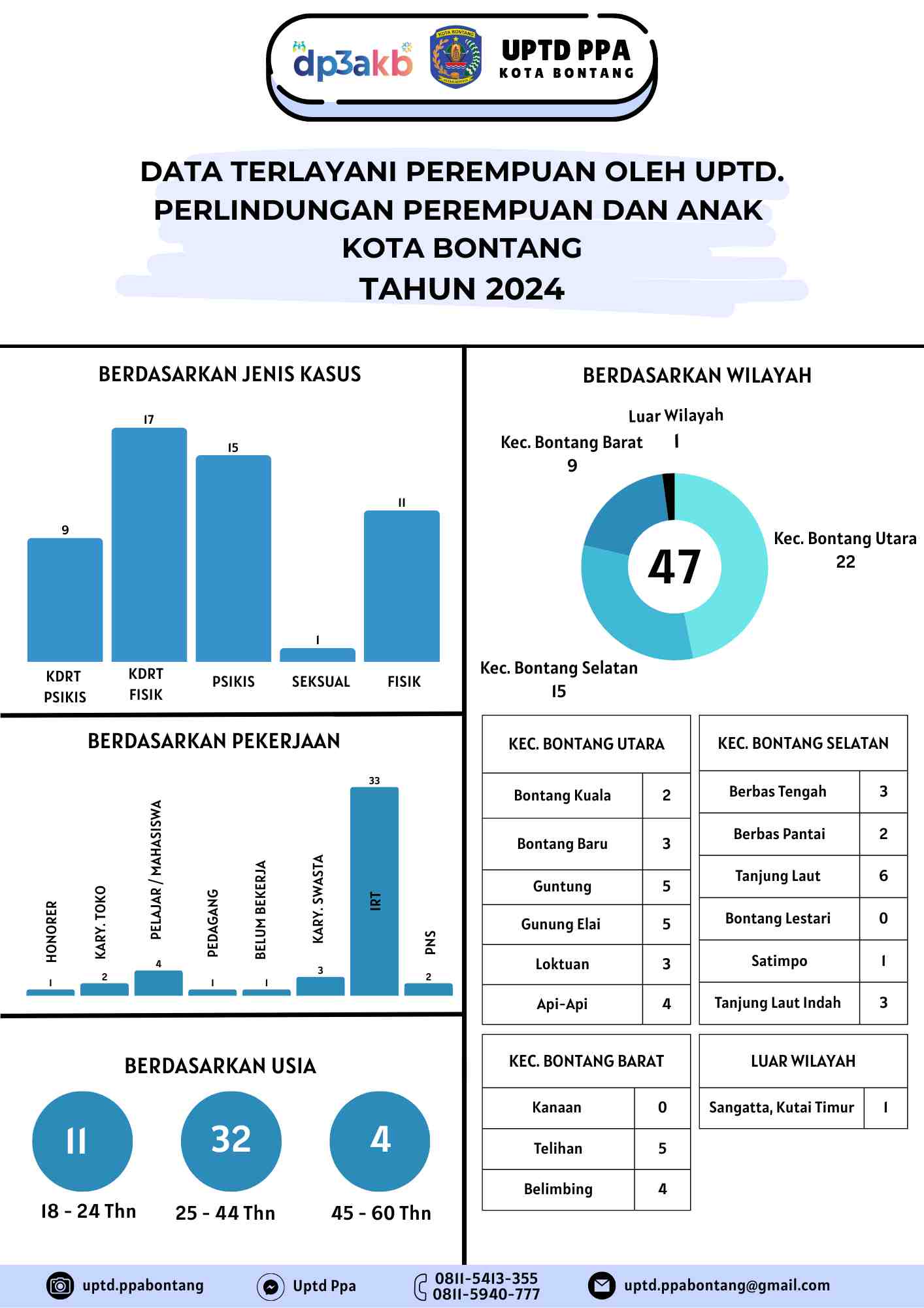 UPTD Perlindungan Perempuan dan Anak (PPA) Kota Bontang mencatat sebanyak 47 kasus perlindungan perempuan yang ditangani sepanjang tahun 2024.Berdasarkan wilayah, ...